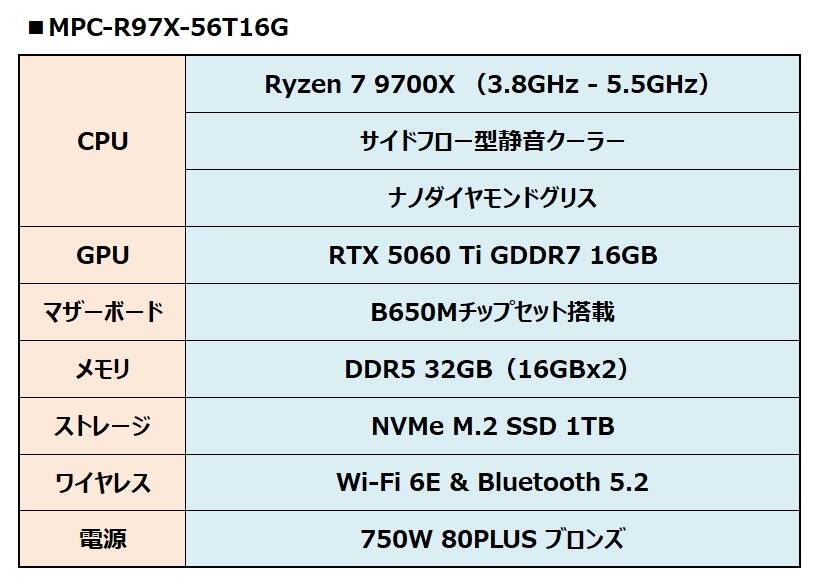 Ryzen 7 9700X / RTX 5060 Ti 16GB / メモリ32GB / SSD1TB / WiFI + Bluetooth / Win11 MPC-R97X56T-16G