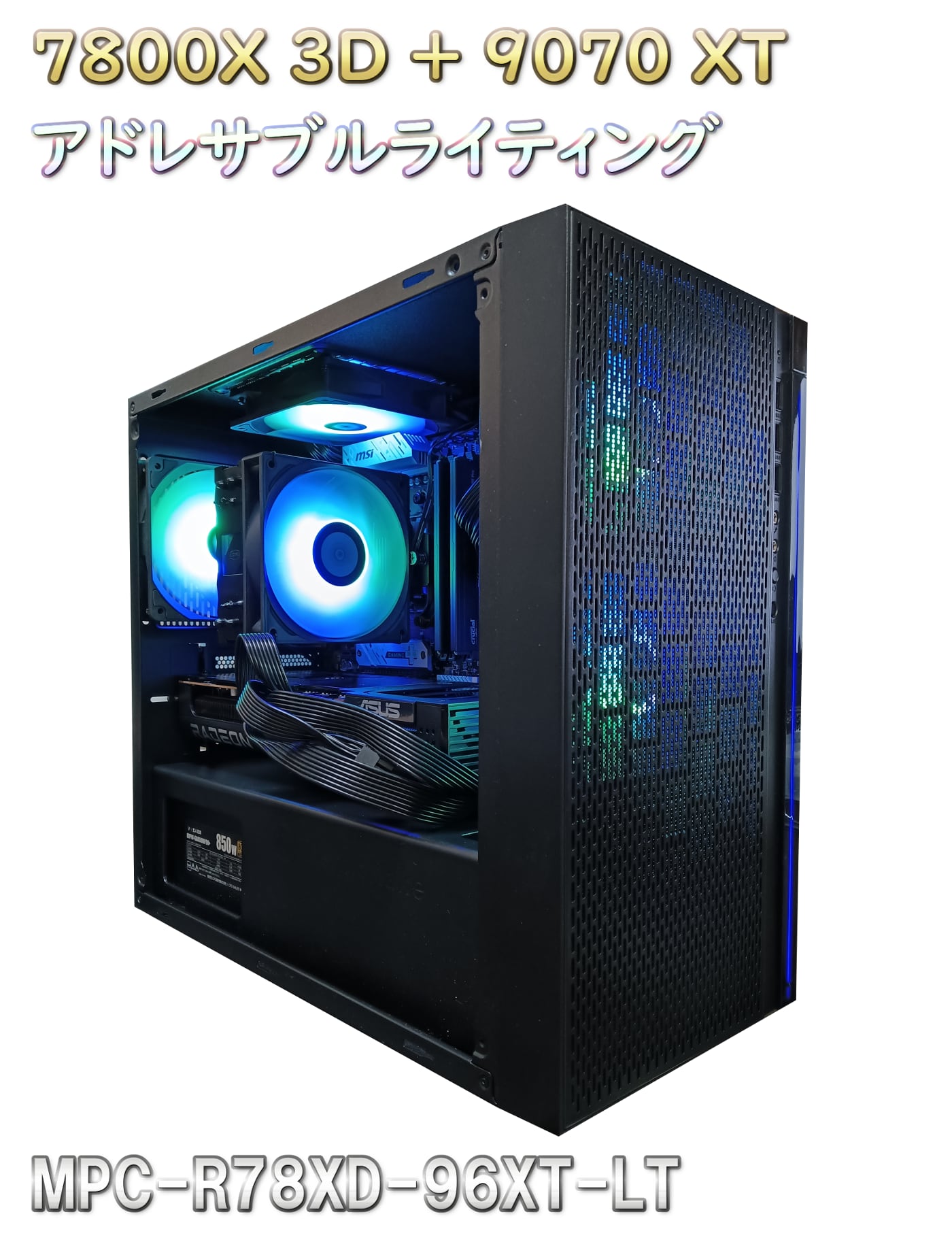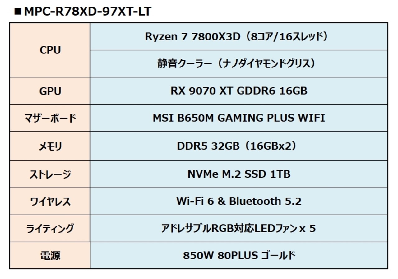 【BASE本店限定1台】アドレサブルライティング対応ゲーミングパソコン Ryzen 7 7800X3D / RX 9070 XT / メモリ32GB / SSD1TB / Wi-FI + Bluetooth / Win11 MPC-R78XD-97XT-LT